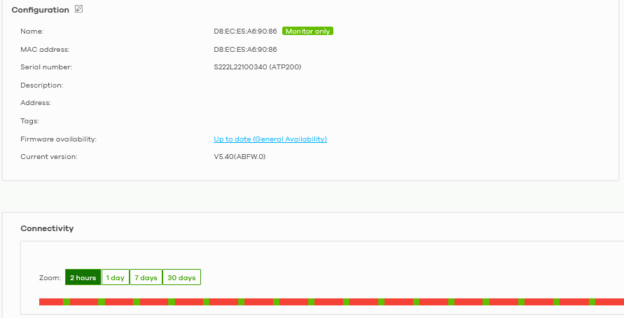 Hi! I have ATP200 in cloud monitoring mode, internet speed is more 100mbs, but in Nebula connectivity with firewall is very intermittent.