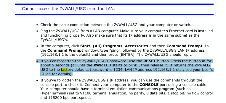If your device is ZyWall USG 20, please press the reset button for 5 seconds to reset to default.