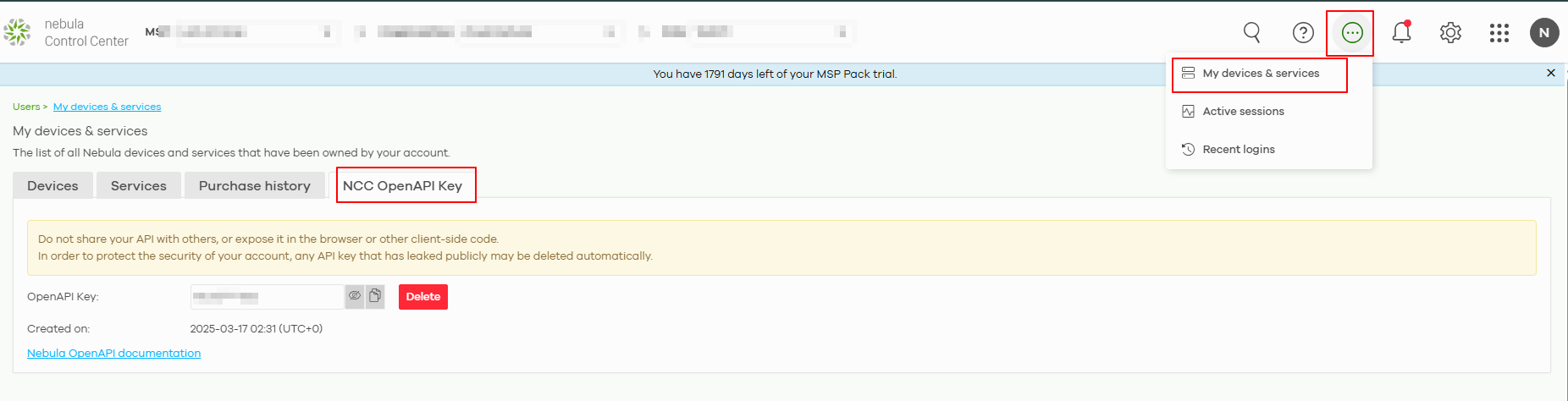 - Log into the Nebula Control Center: Access your account through the Nebula platform and navigate to the "API Key Management" section under "User's Device and Service."