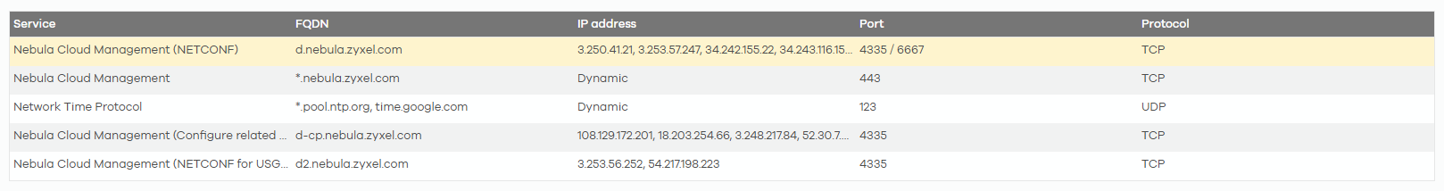 UDP 123: Port for NTP time sync, Nebula devices require synchronizing a universal time, the feedback from Nebula devices to the server, and also statistical information greatly require a correct time kept on the devices.