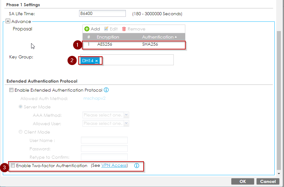 Note! You can also use DH2 and DH14 on both "Phase 1" and "Phase 2" settings if other devices (such as old Android phones) cannot connect.