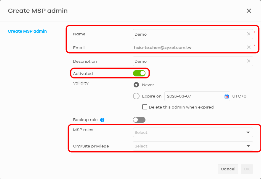 5. Assign the MSP roles and Org/Site Privileges.