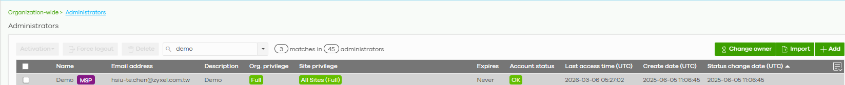 Additionally, when you go to the corresponding organization > Organization-wide > Administrators, you will also see that the account has been added as an administrator of the organization with the Org and Site Privilege.