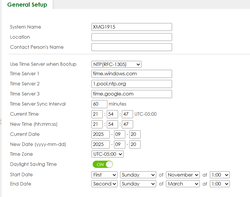 This morning I decided to try again. I set the time server to "None" as my previous setting of NTP (RFC-1305) would not work.