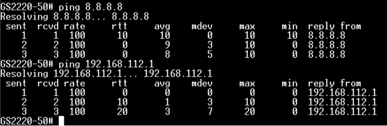 - If ping 8.8.8.8 fail and ping default gateway fail. Please check the routing and physical connection between switch and gateway.