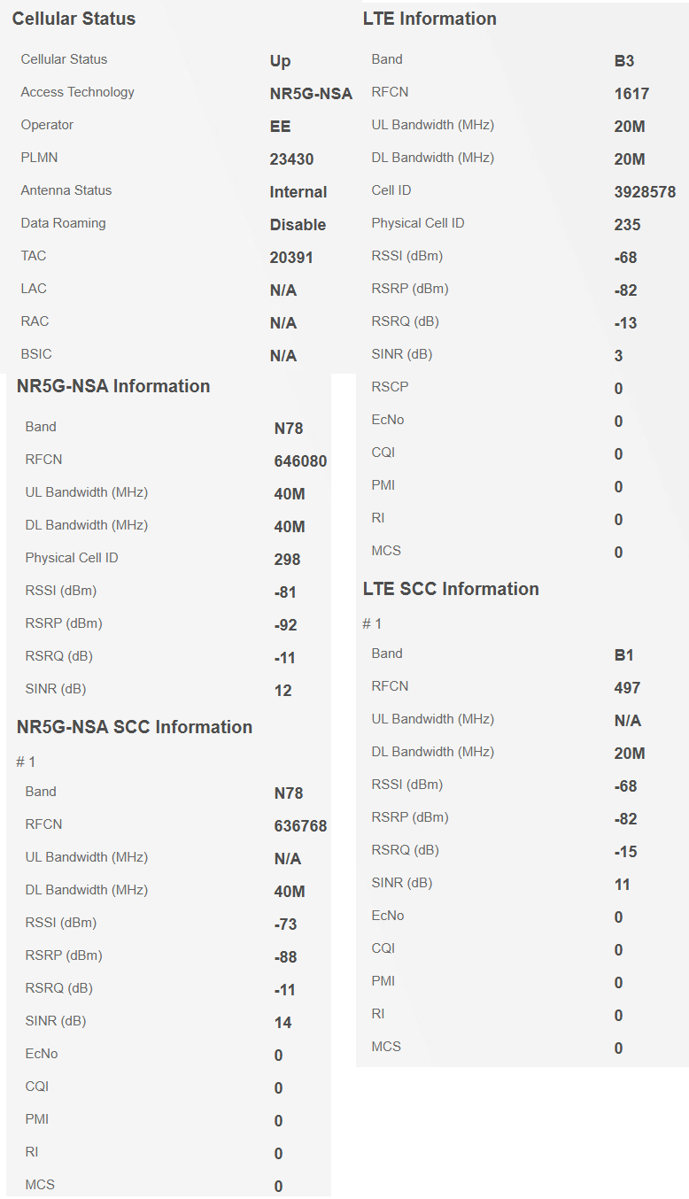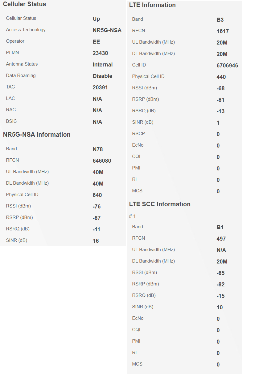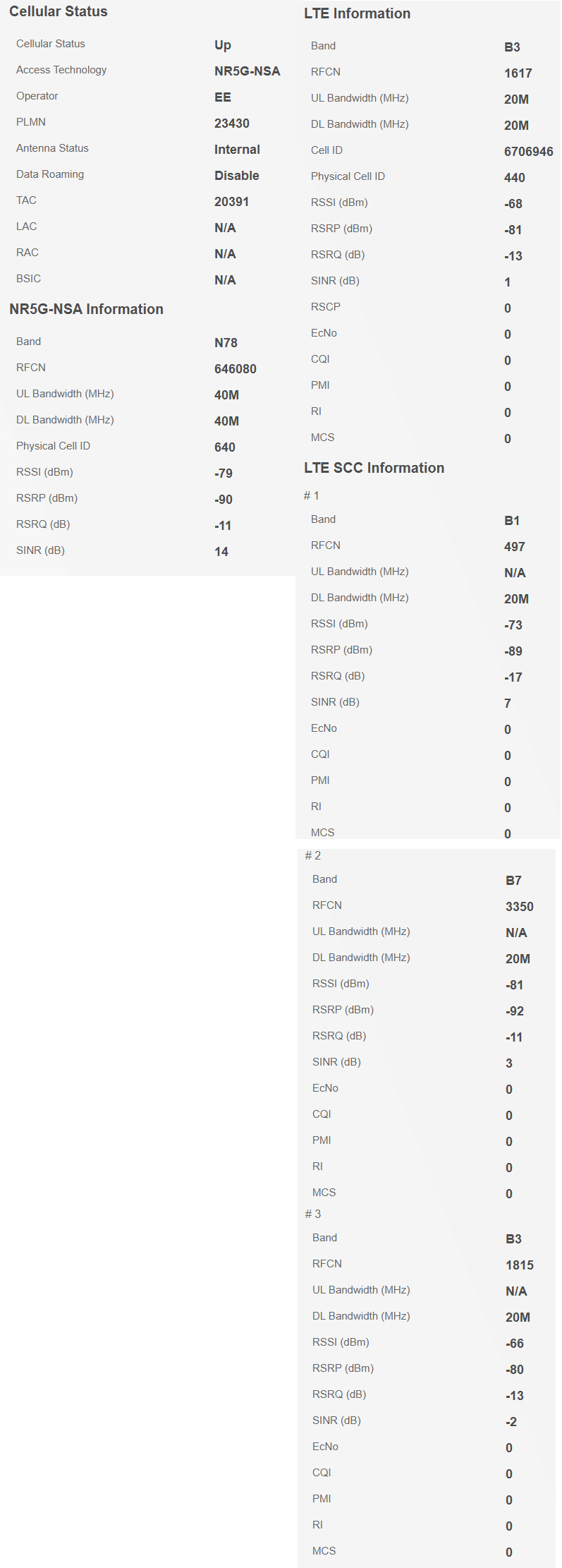So with a uptime of 1 day 8 hours the Cellular Info has changed with no NR5G-NSA SCC but speed is still fine at this time.