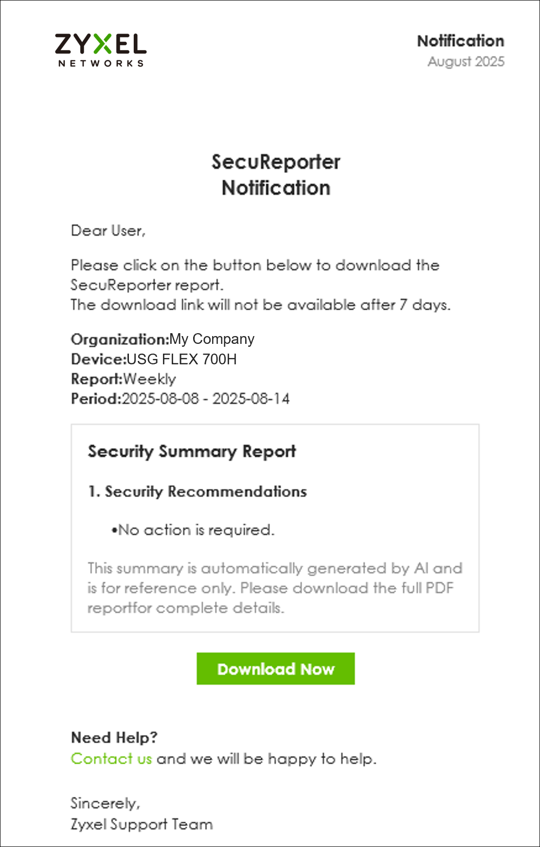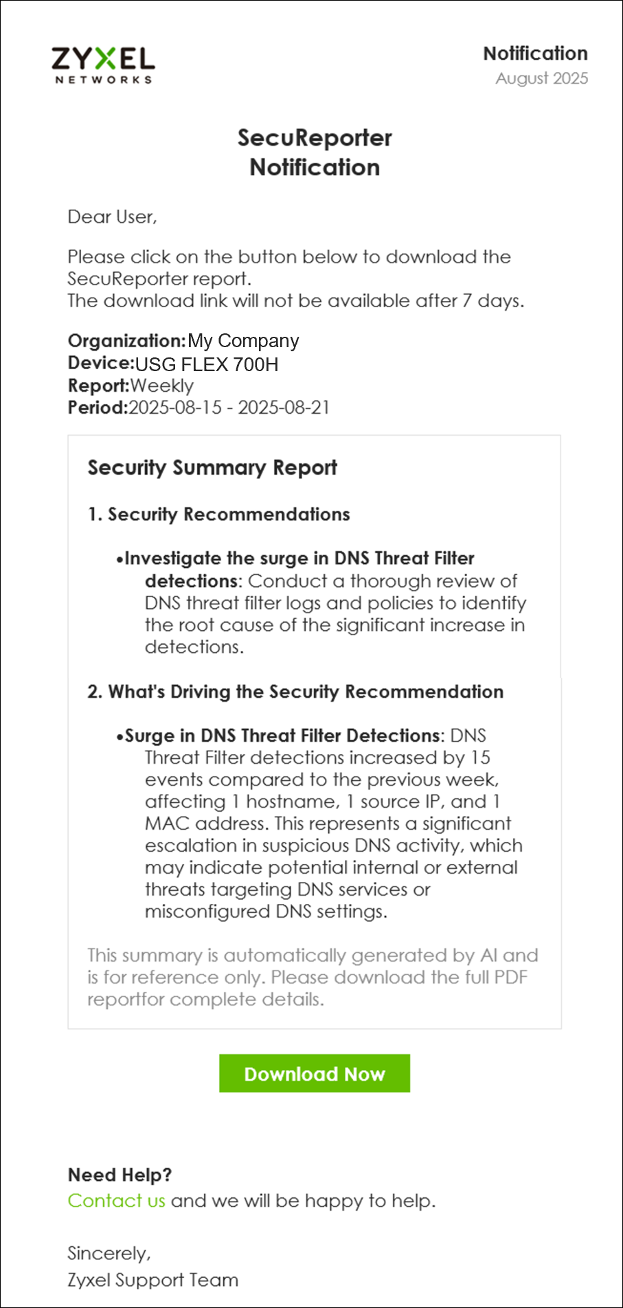 Every week, SecuReporter automatically prepares an AI-generated digest of your network activity. Instead of flipping through a full PDF report, you’ll receive an easy-to-read summary that highlights key insights—whether it’s unusual spikes in detections or noteworthy changes in trends.