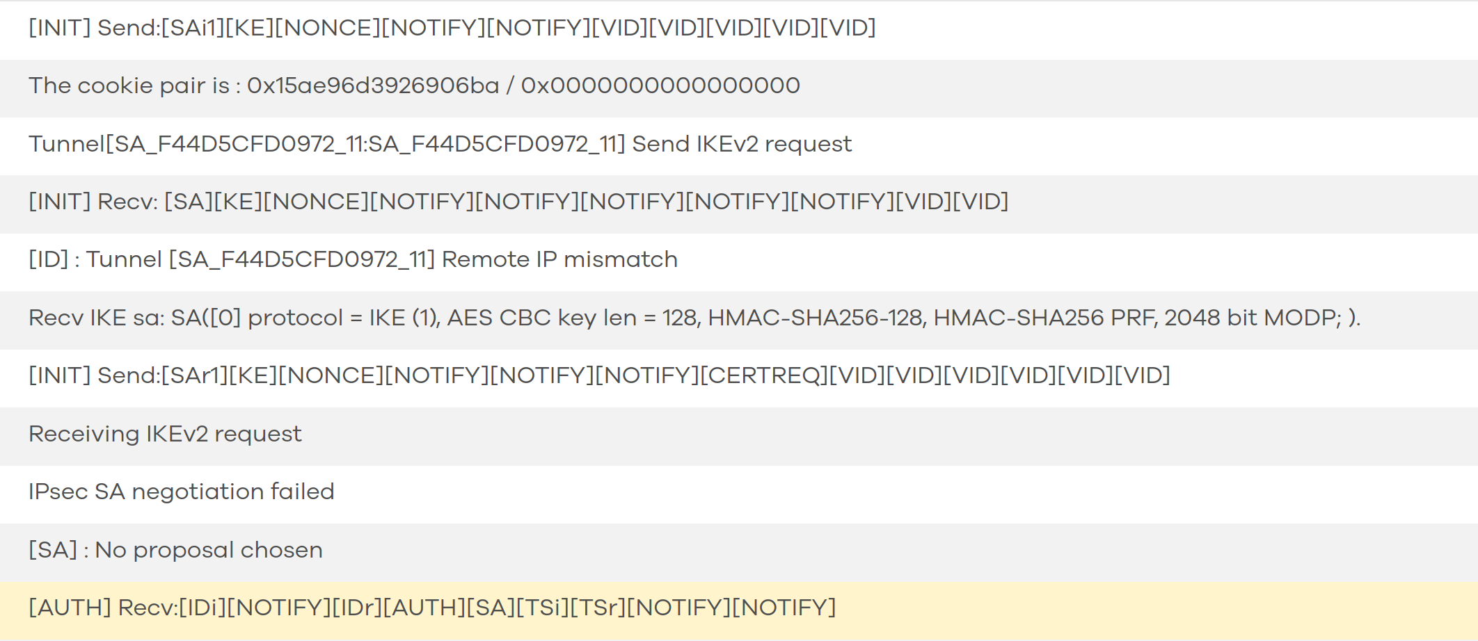 The log shows that some of the rows show that the other site is able to send a message back (the [auth] line), and some lines show that the target IP is on some of these is the IP behind the NAT (part of IKE SA log lines and The cookie pair line).