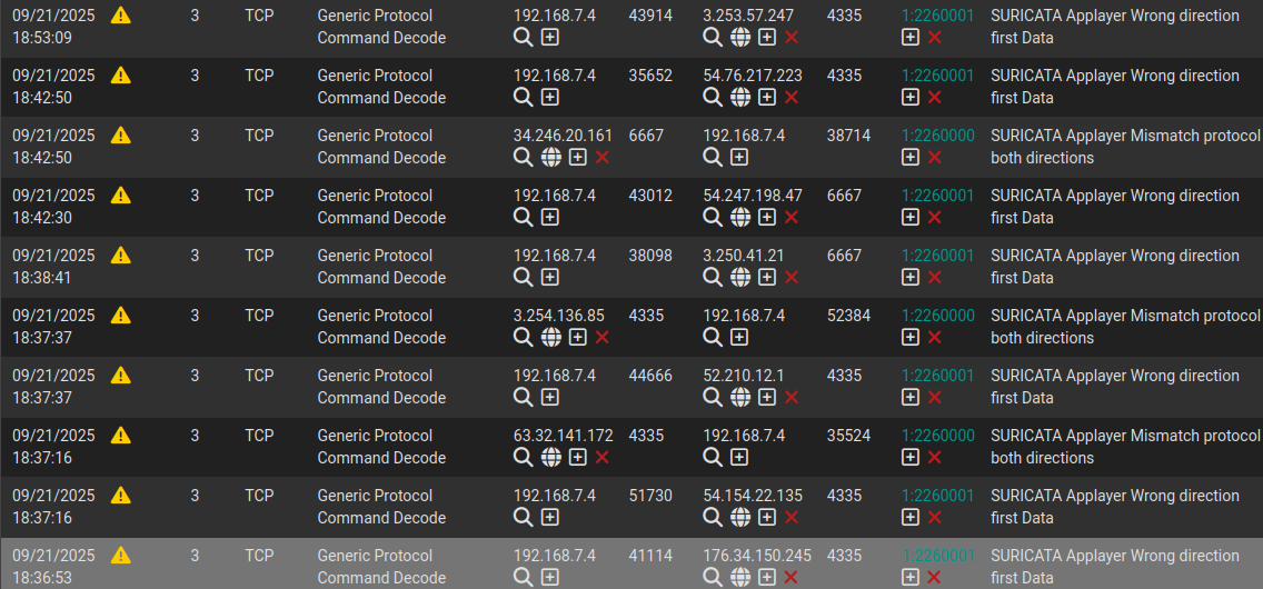However, I am seeing some very surprising connections for a standalone device. It is connected to a firewall with Suricata on its interface, which is not happy.