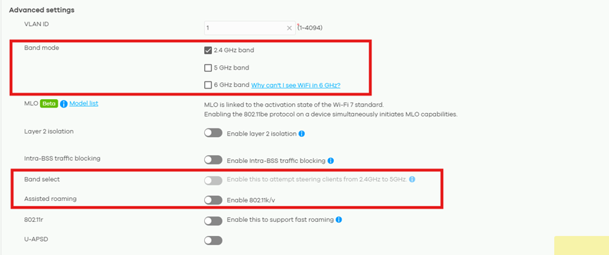 - Disable Assisted Roaming to ensure the device maintains a stable connection on the 2.4 GHz network
