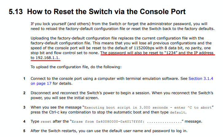 Please try the procedure described in our User Guide under “How to Reset the Switch via the Console Port” section to reset your device: