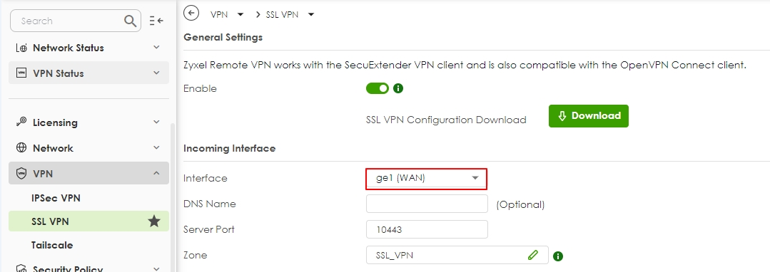 - Navigate to SSL VPN > Incoming Interface.