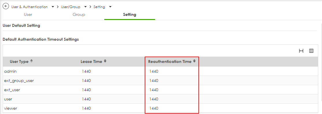 - Adjust the "Reauthentication Time" for each user type account as needed.