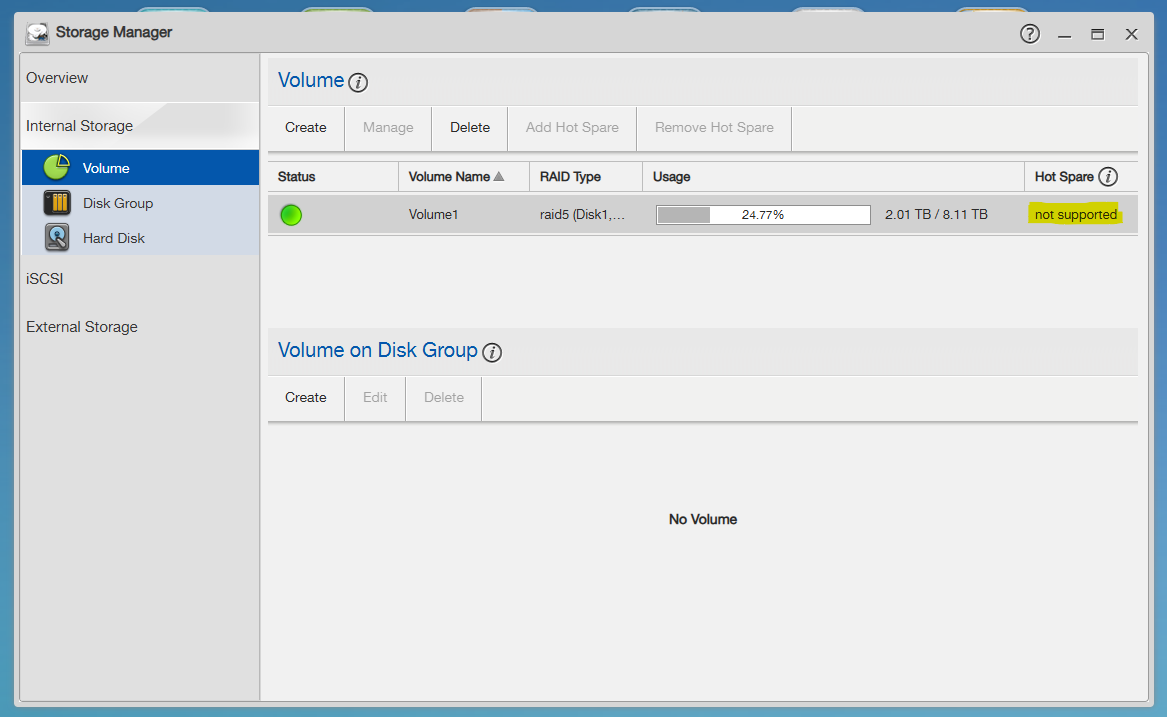 I am currently using a NAS 542 with 4 drives in RAID 5. While checking my hdd health I stumbled across a small notification in my Storage Manager stating Hot Spare is not supported.