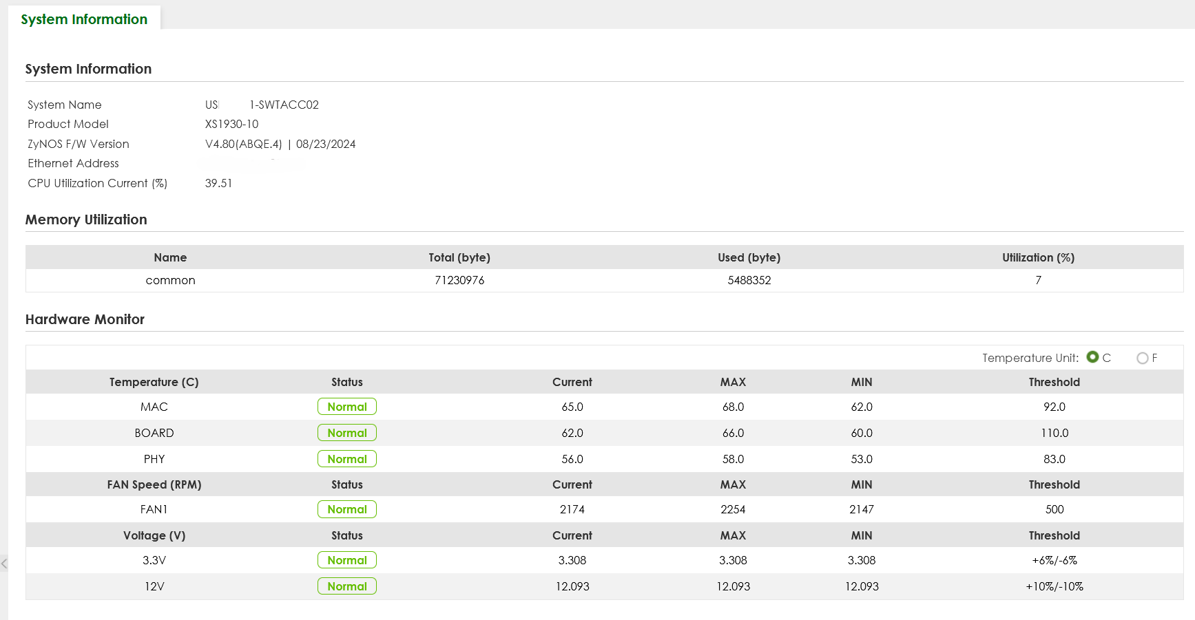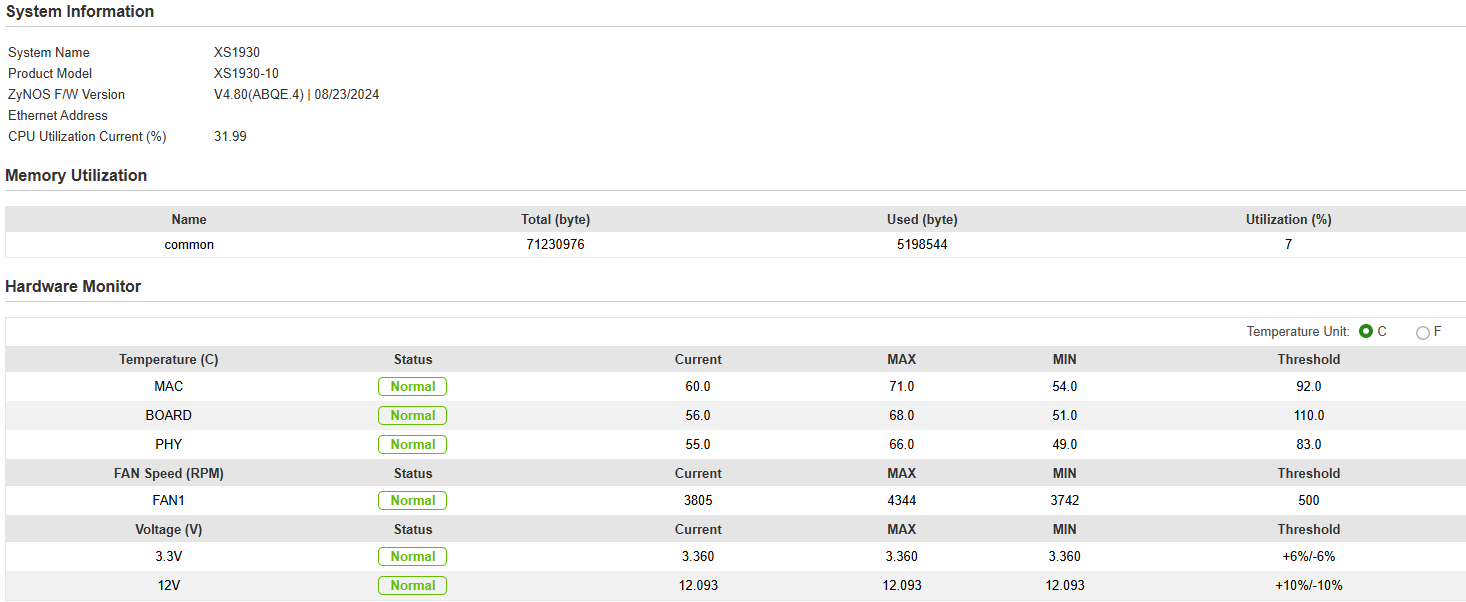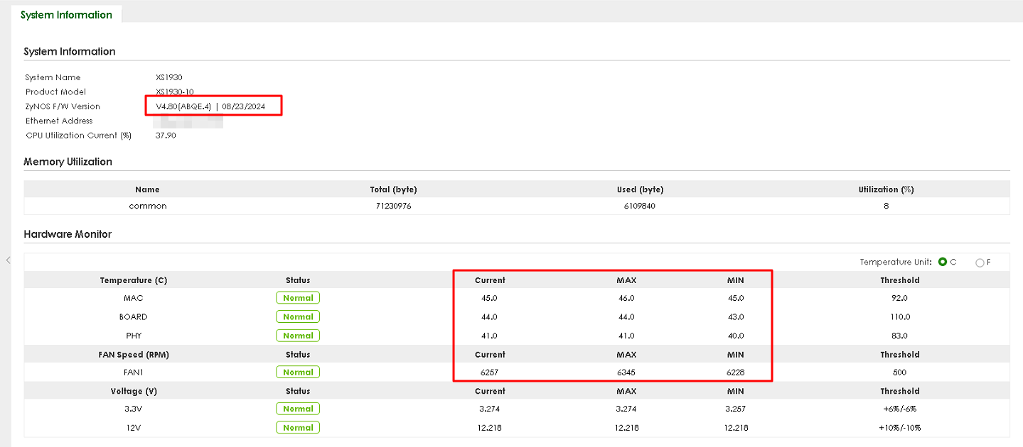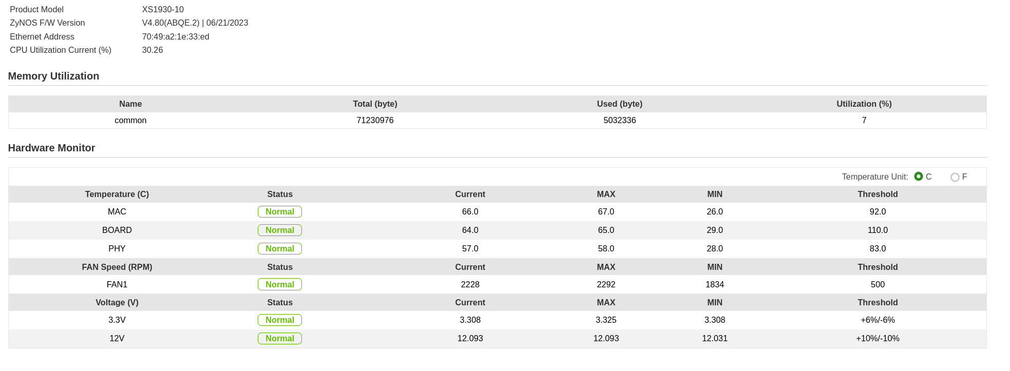 First, the device's temperature is still normal since it doesn't go over the threshold. However, the fan speed seems lower than expect. Could you help to upgrade your firmware to the latest version? Because my lab XS1930 with 4.80 patch 4 have higher FAN speed (around 6200 RPM) and the lower temperature.