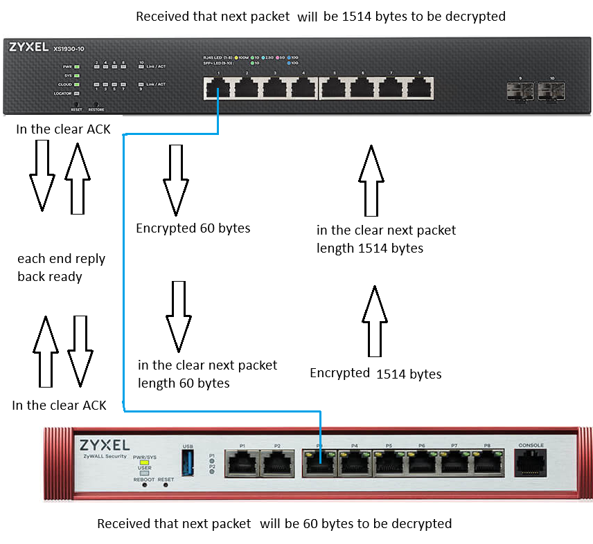 My first idea was each end has the same encrypted and decrypted key and each packet would be encrypted like everything because this is link to link you just send the packet out but then I realized this would not work the part about sending the encrypted packet out would work but then how would you know what to decrypted at what packet length? So one way to solve this at the cost of bandwidth is the switch and USG before sending encrypted packets out is when the link is established both ends send a in the clear ACK then when each end is ready before sending encrypted packets the switch and USG link puts a in the clear packet saying the length of the next encrypted packet for each packet so that each end will know what to decrypt.