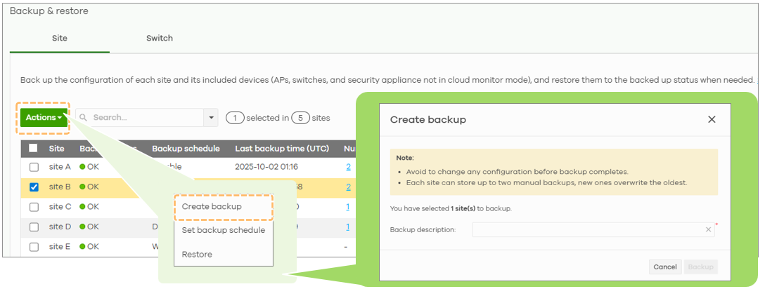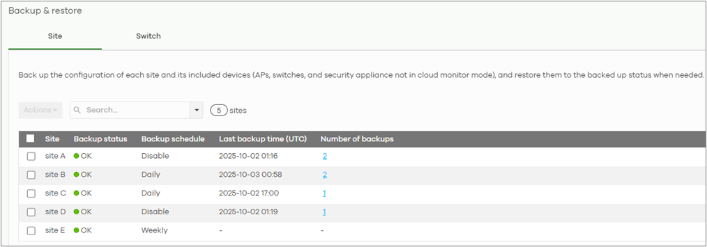 The Switch Backup & Restore tab allows backing up and restoring individual switch configurations without involving the entire site.