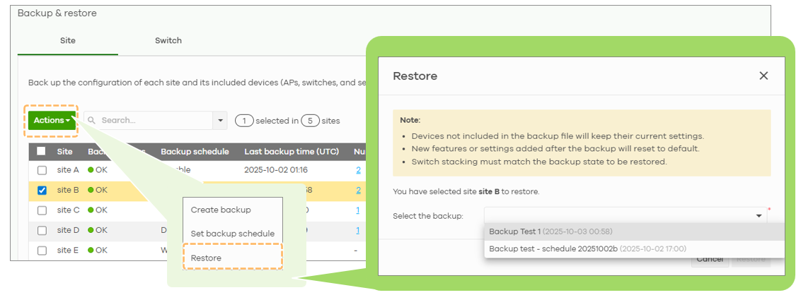 Some administrators only need to restore a switch’s configuration without affecting access points or firewalls.This new independent function provides that flexibility.
