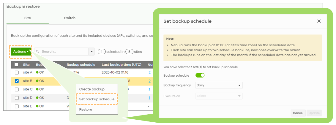In Nebula version 19.20, the Backup and Restore feature has been redesigned and elevated into an independent menu item within the NCC interface. This update provides administrators with clearer visibility, easier control, and new automation options for backing up and restoring configuration data across sites, switches, firewalls and mobile routers.