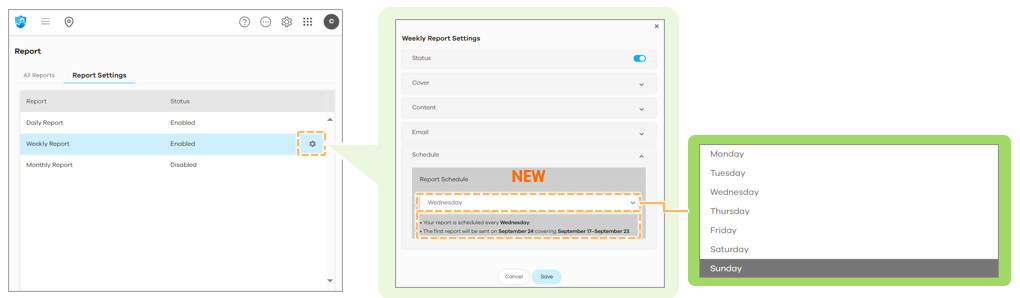Previously, SecuReporter automatically generated weekly reports every Sunday at midnight—with no way to modify the schedule. For many organizations, this didn't align with their internal reporting cycles or review processes.