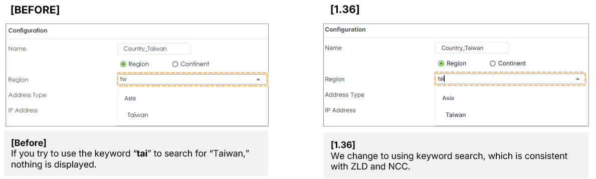 Previously, Geo IP object creation required searching by country abbreviations (e.g., TW, US, FR).
