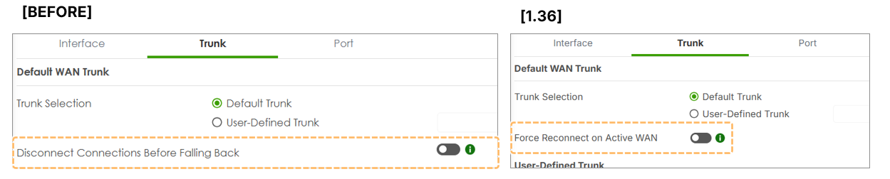 This modification clarifies that when WAN failback occurs, the device will disconnect the existing session and reconnect through the newly active WAN interface. The functionality itself remains unchanged — only the message is made clearer to avoid confusion.