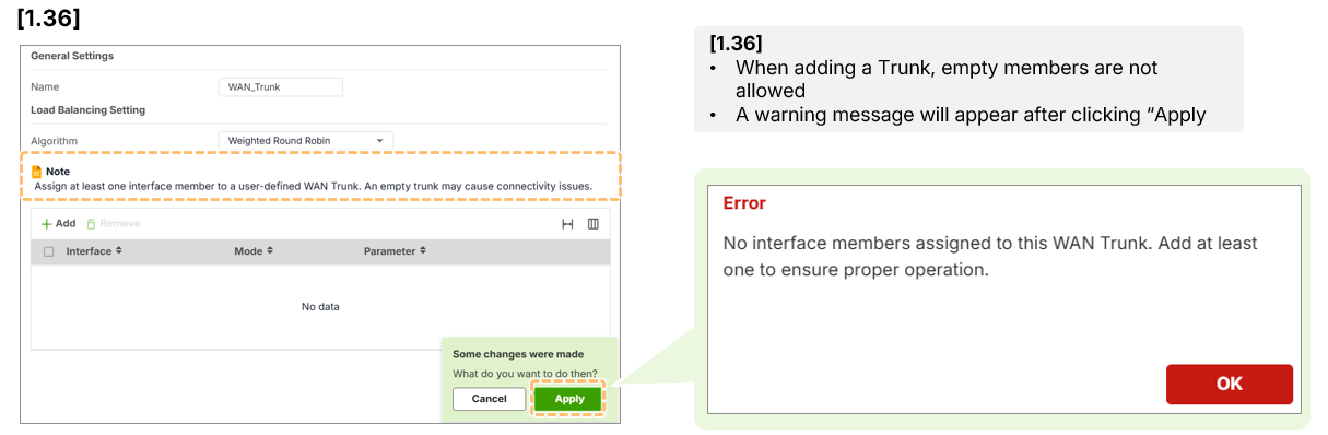 In previous versions, administrators could create a trunk without any member interfaces, which could lead to traffic forwarding issues.