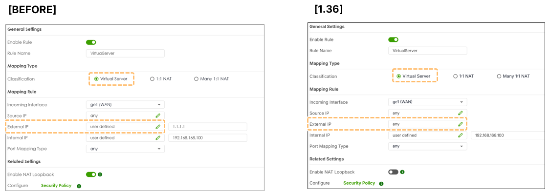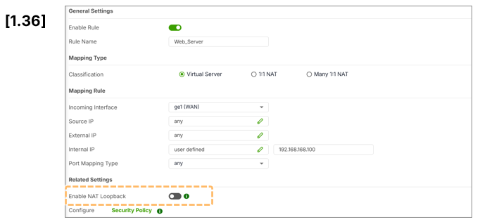 Since NAT loopback is not compatible when the external IP is set to “Any”, it is now disabled by default for all mapping types. Users who need NAT loopback must manually enable it after configuration.