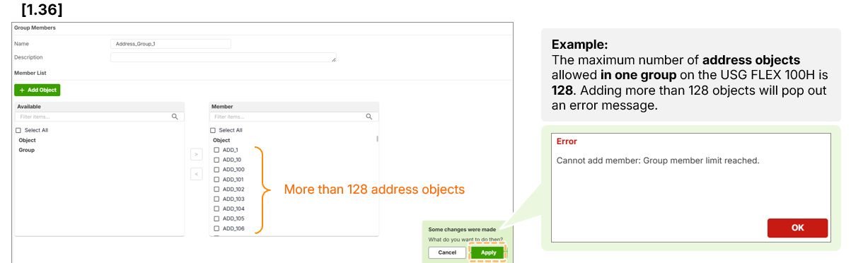 Each firewall model has a hardware-specific limit on the number of objects per group (e.g., 64, 128, etc.).In previous versions, exceeding the limit caused silent truncation during policy application.