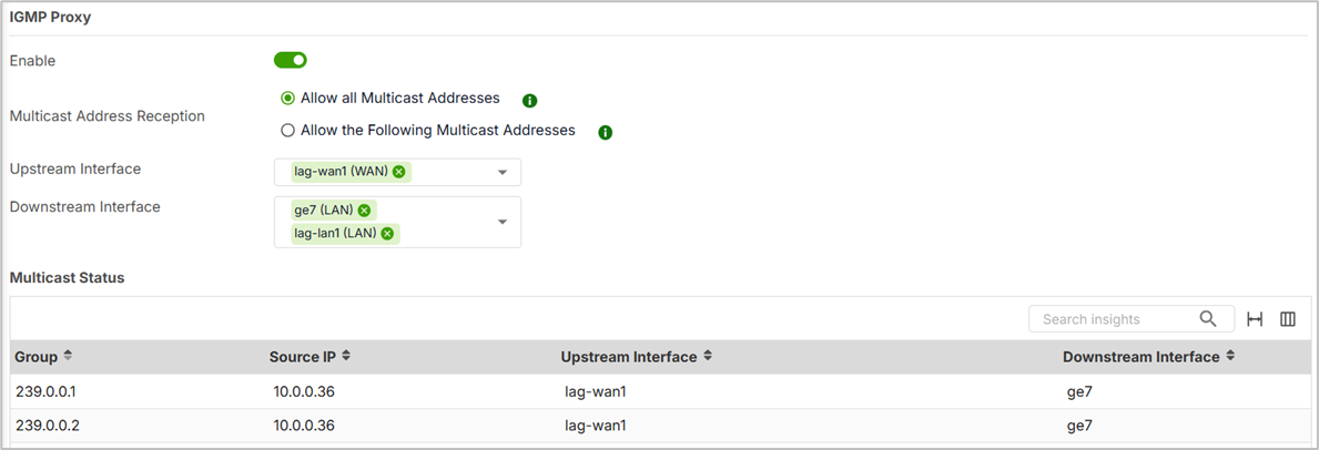 IGMP Proxy allows the firewall to act as a multicast router (or agent) between multicast servers (upstream) and clients (downstream). It enables the firewall to manage IGMP (Internet Group Management Protocol) messages and selectively forward multicast streams only when clients request them.