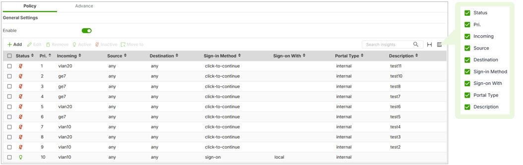 With the new firmware upgrade, the Auth Policy List has been added with a filterable UI, allowing administrators to select and display only the information they need. This makes it significantly easier to manage complex policies and improves the overall usability of the Captive Portal settings.