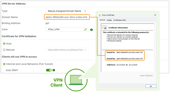 - The VPN certificate issued by Nebula automatically includes the domain