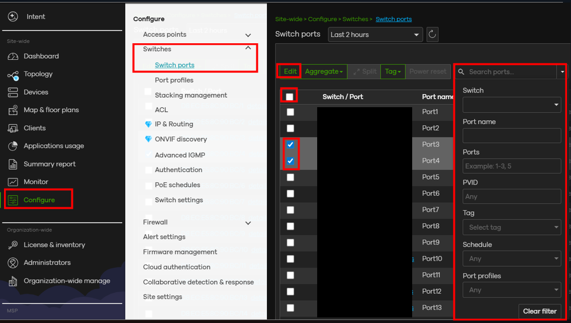 We recommend using the filter together with the Select All option to quickly choose and edit the ports you want to configure.