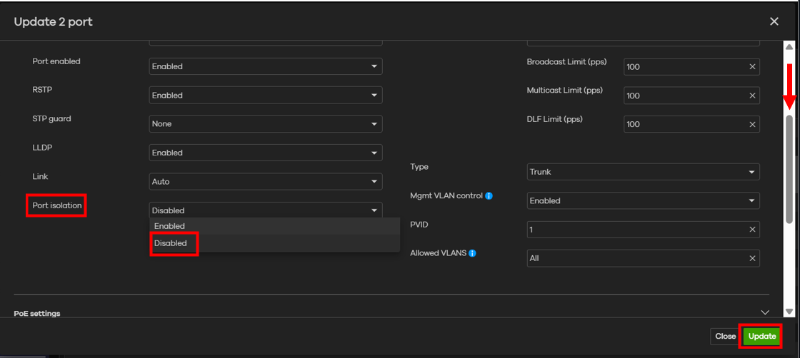 After entering the port editing page, scroll down and locate the Port isolation setting.