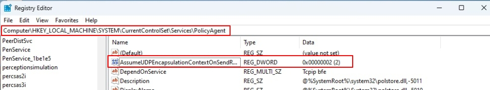 • Modify the registry: Open Registry Editor by typing regedit in the Run dialog (Win + R). Navigate to HKEY_LOCAL_MACHINE\SYSTEM\CurrentControlSet\Services\PolicyAgent and add a new DWORD (32-bit) Value named AssumeUDPEncapsulationContextOnSendRule. Set its value data to 2 and restart the computer. This enables the client to connect to an L2TP/IPsec server behind a NAT device.