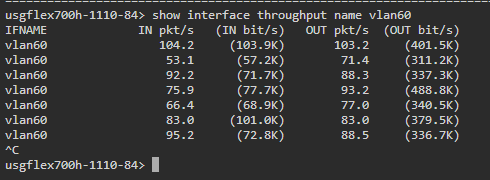 First, use the CLI command show interface to identify the interface name. Then, run the command show interface throughput name vlan60 to obtain the real-time throughput.