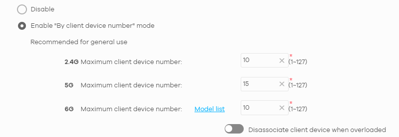 *The Disassociate client device when overloaded function is enabled by default and the disassociation priority is always Signal Strength when you select this option.