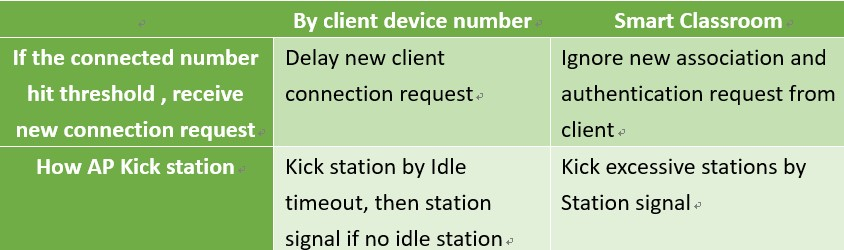 The AP kicks excessive clients instantly and ignores response, authentication and probe request packets from any client device when the maximum number of client devices is reached. Disassociate client device when overload is default enabled and disassociation priority is always signal strength.
