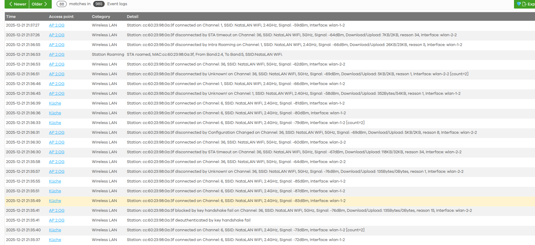 After reviewing the logs, we suggest enabling 802.11ax mode on both 5 GHz and 6 GHz under the radio settings and staying closer to the AP to see if the connection improves. (The logs from your screenshot show low signal strength, sometimes from -79dBm to -87dBm, which may be affecting stability.)