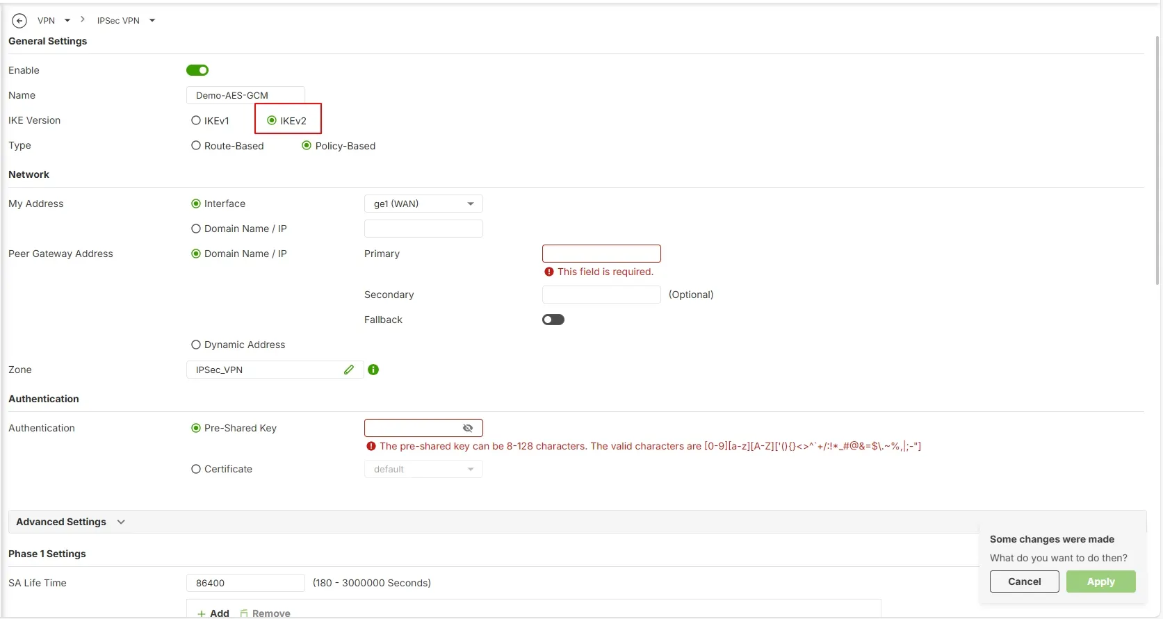 - Surf to the VPN > IPSec VPN settings page, in the IKE version choose “IKEv2”.