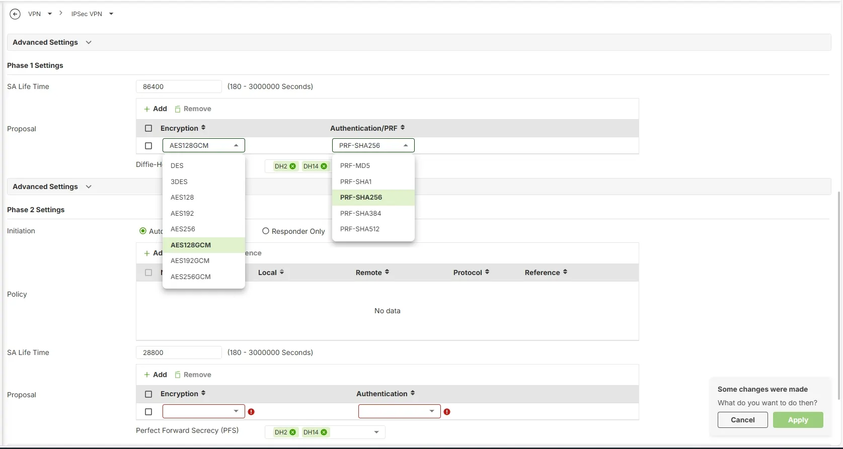 2. In the Phase 1 settings page, from the drop down list choose “AES128GCM” under the Encryption column, and “PRF-SHA256” under Authentication/PRF column.