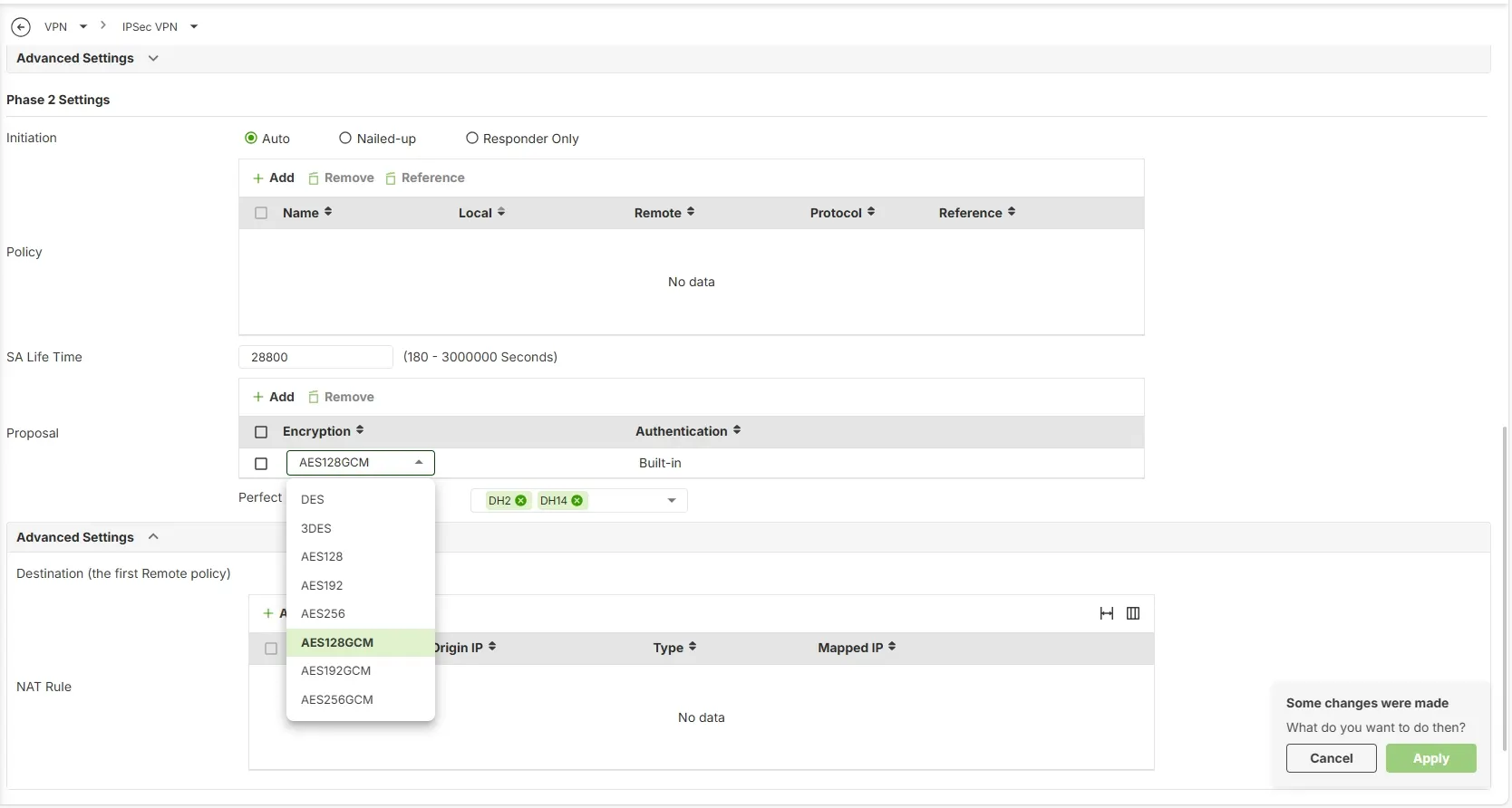 3. In the Phase 2 settings page, from the drop down list choose “AES128GCM” under the Encryption column.