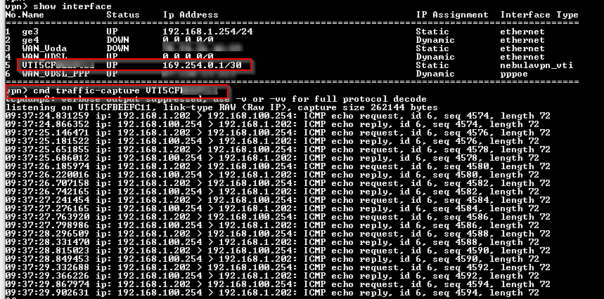 The user can use the Nebula GUI path to check the Nebula SD-VPN status and can also use the CLI to capture packets. Once the Nebula SD-VPN connection is established, an interface beginning with "VTI" will appear. The user can then run the CLI command traffic-capture VTIXXXXXXXXXX