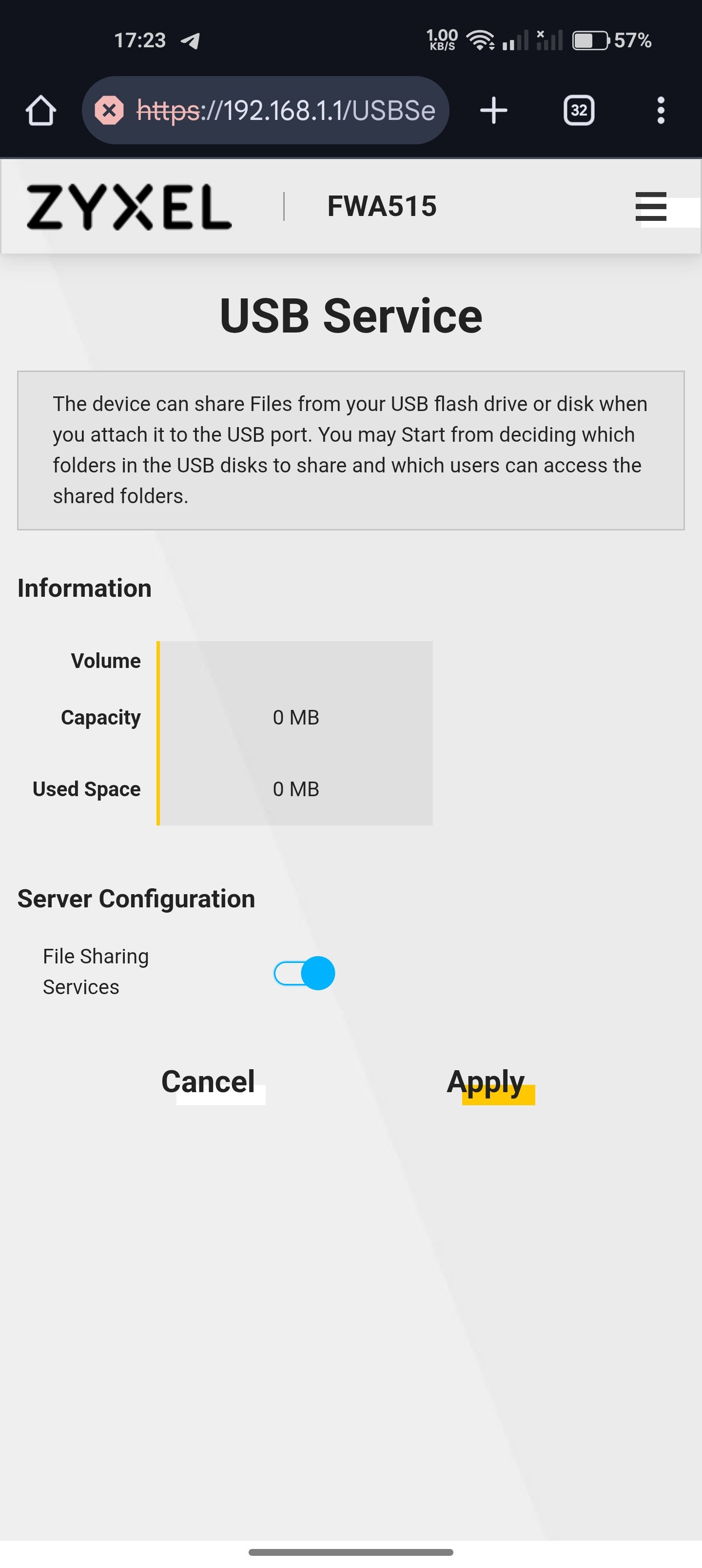 Hello, I have a FWA515 router, I connected a WD purple 1TB hard drive in an Orico enclosure to the USB port, the router showed that a 1TB drive was connected, it showed how much space was used and free on the drive, but I can only enable file sharing and confirm this change, there is no server configuration, I cannot specify directories for sharing, set a password, or give read-only permissions. The picture shows the state without the disk connected, when the disk is connected it shows that it sees it but there are no other options than what is shown in the picture, the latest firmware available on the website