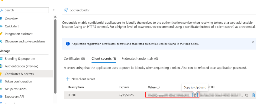 Client Secret: {You already have Secret at “Manage > Certificate & secrets”)