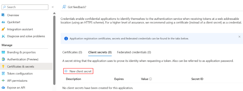 5.Navigate to Manage > Certificate & secret > New client secret.