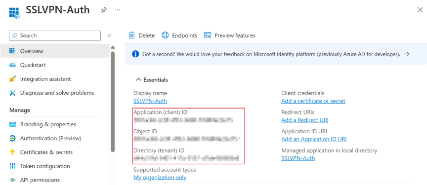 Overview your Entra App, you need “Client ID”, “Tenant ID” for Firewall setup.