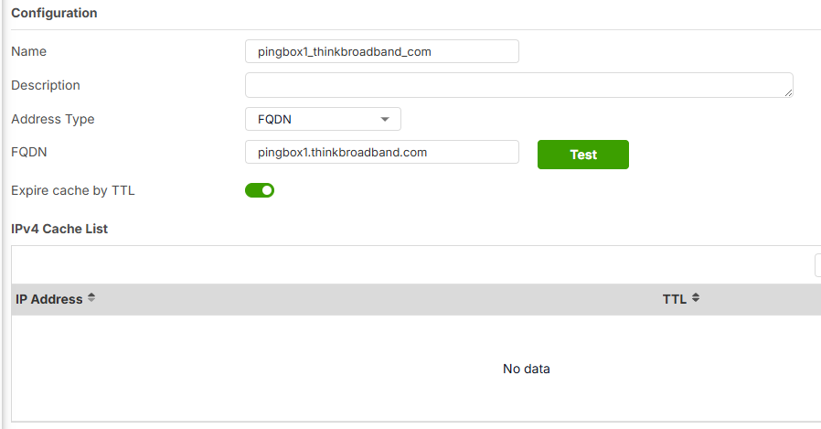 update in testing on the FQDN Address Object configuration for pingbox1.thinkbroadband.com I click the test button I get this