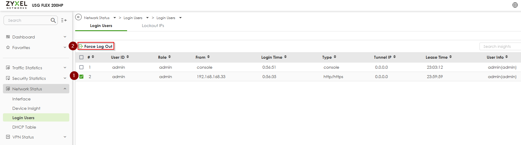 Please navigate to Network Status > Login Users > Login Users, select the user, and then click "Force Log Out".