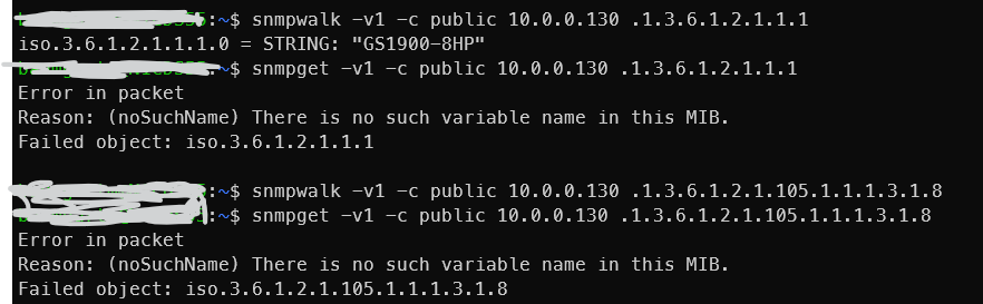 What is interesting: The first query with snmpwalk succeeds on the very basic OID. With snmpget it fails. I also use MIB Browser under Android. There it is similar, i.e., when browsing, most OIDs are read, but when polling, an error occurs.